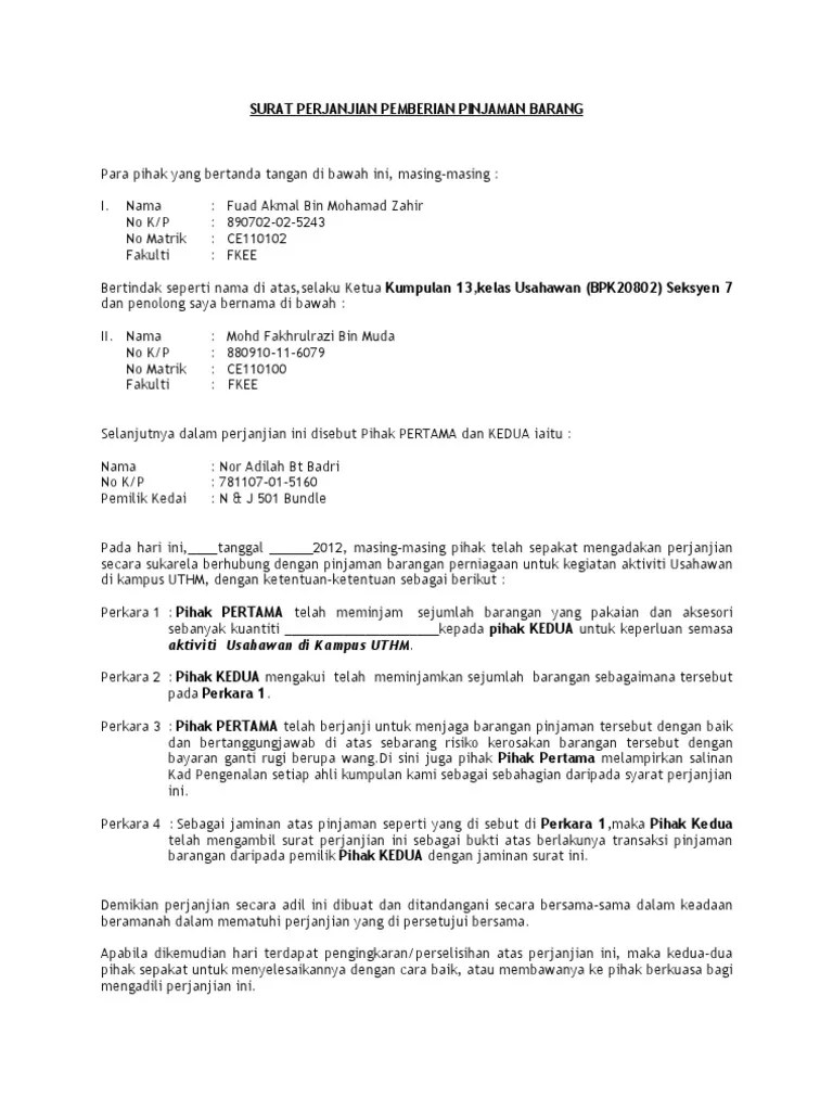 . You have just read the article entitled Perjanjian Pinjaman Wang. Ahmad Izzuddin Bin Zakaria B41 Kampung Paya 21600 Marang Terengganu. Ini Contoh Surat Perjanjian Terbaik Untuk Bisnis Wajib Coba.